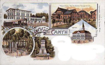 Canth, Bahnhof 2.Klasse, Bahnmeisterei, Stadt 2 km vom Bahnhof entfernt, 3000 Einwohner, katholische und